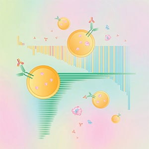 Stylized illustration based on a UMAP plot showing the different immune cell populations present in mouse breast cancer cell xenografts.